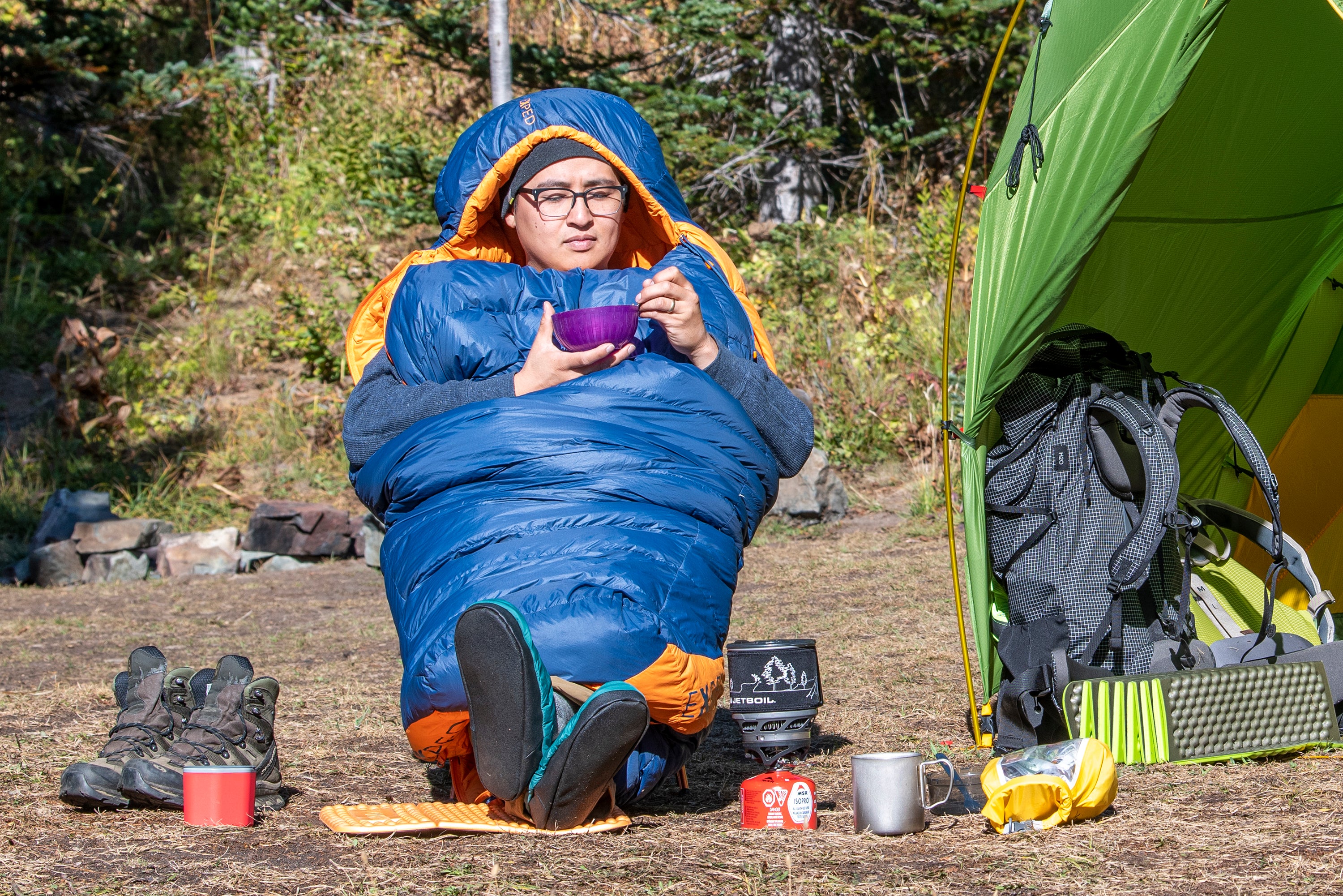 Zippered opening at the foot end converts Comfort into a camp parka for walking around in cool weather.