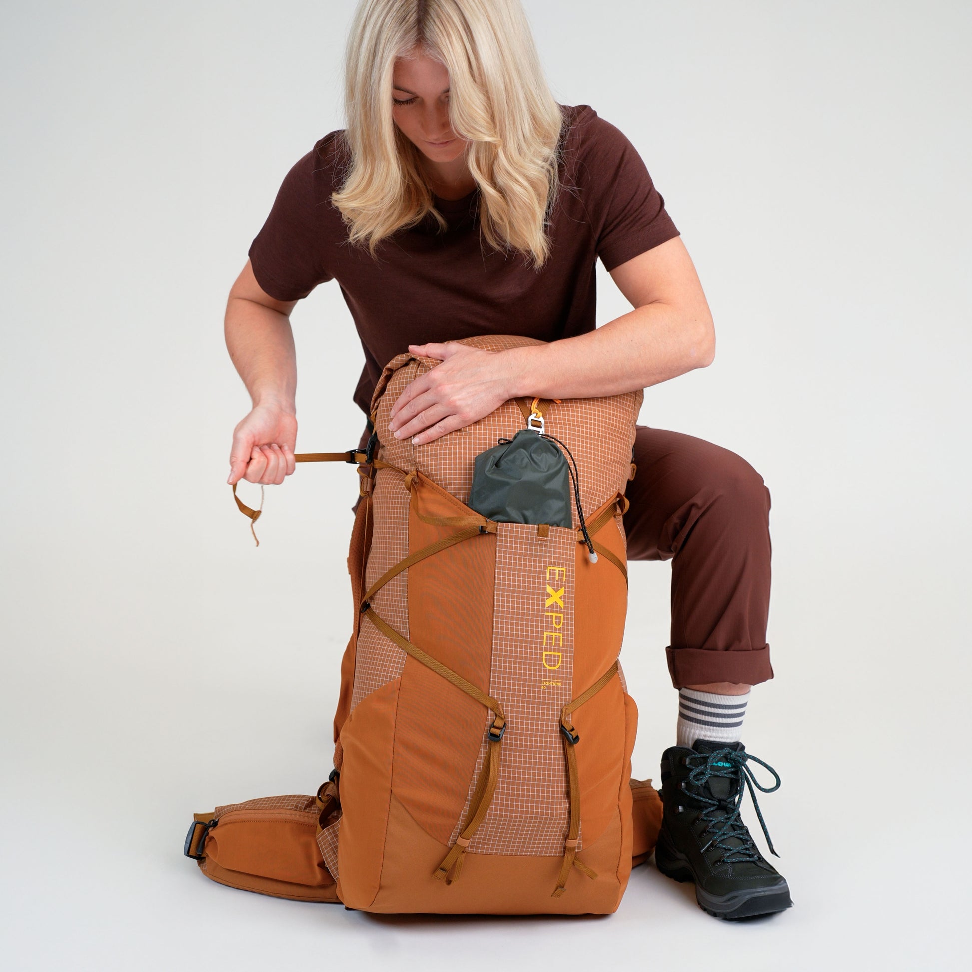 Front & side compression system shrinks pack size or expands to allow more room.