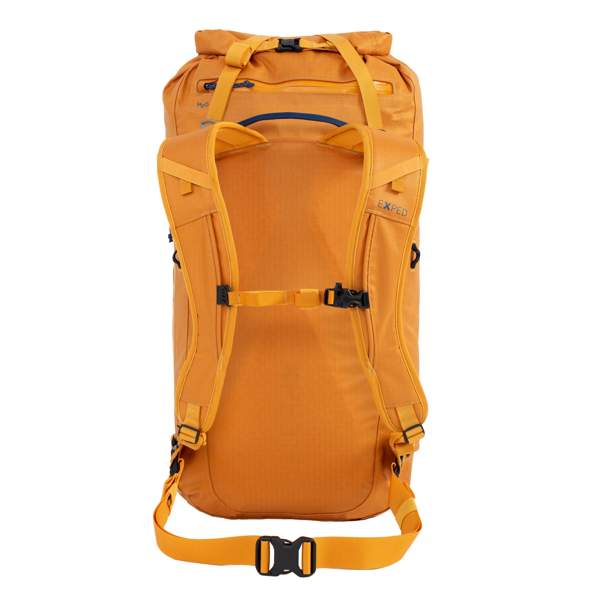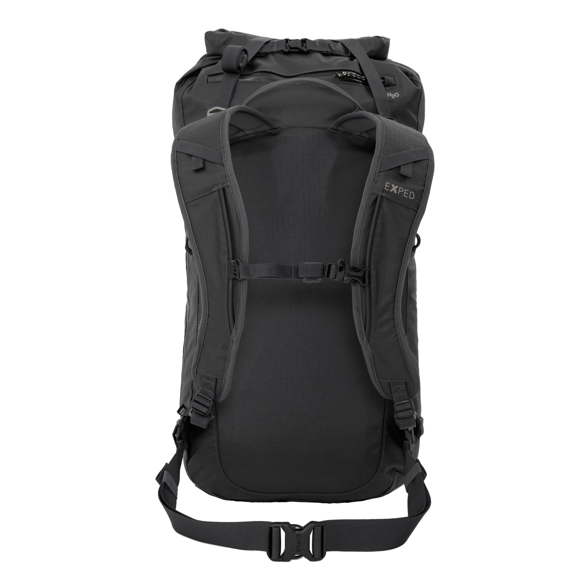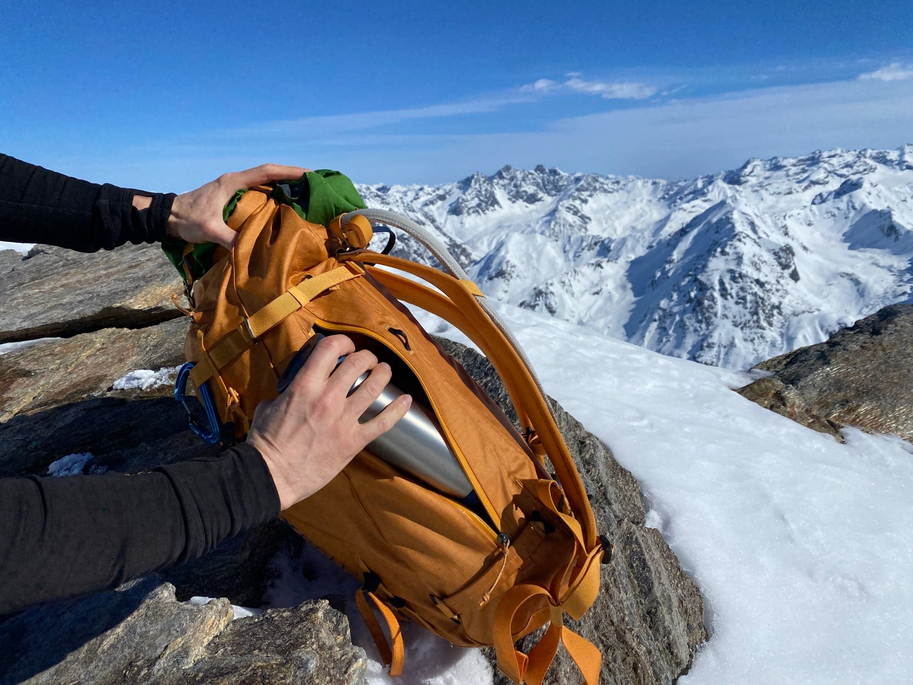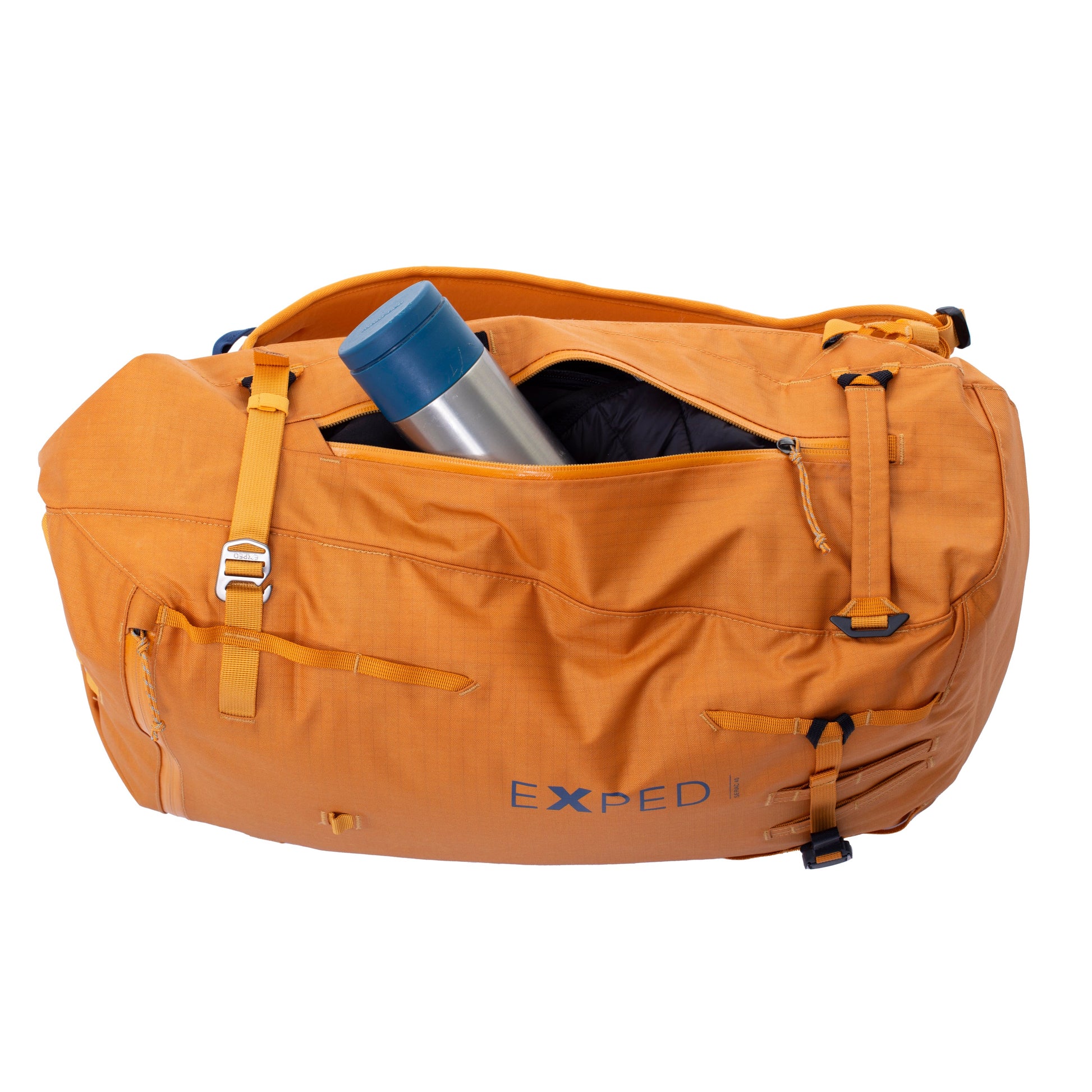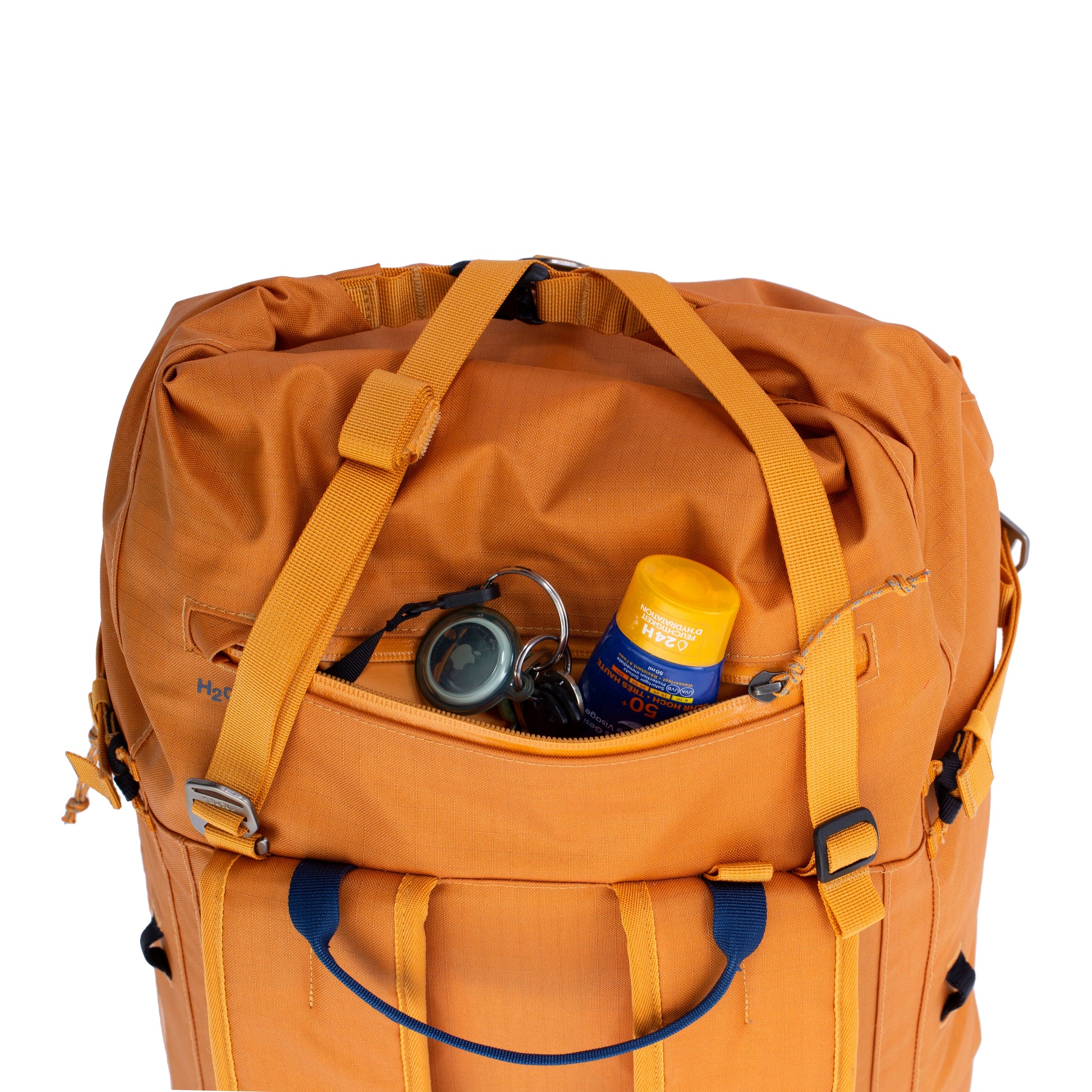 The high-quality, waterproof ripstop nylon with a water column of 10,000 mm, taped seams, a roll-top closure and sealed zippers protect against moisture and snow. The white, PFC-free lamination inside provides the best overview.