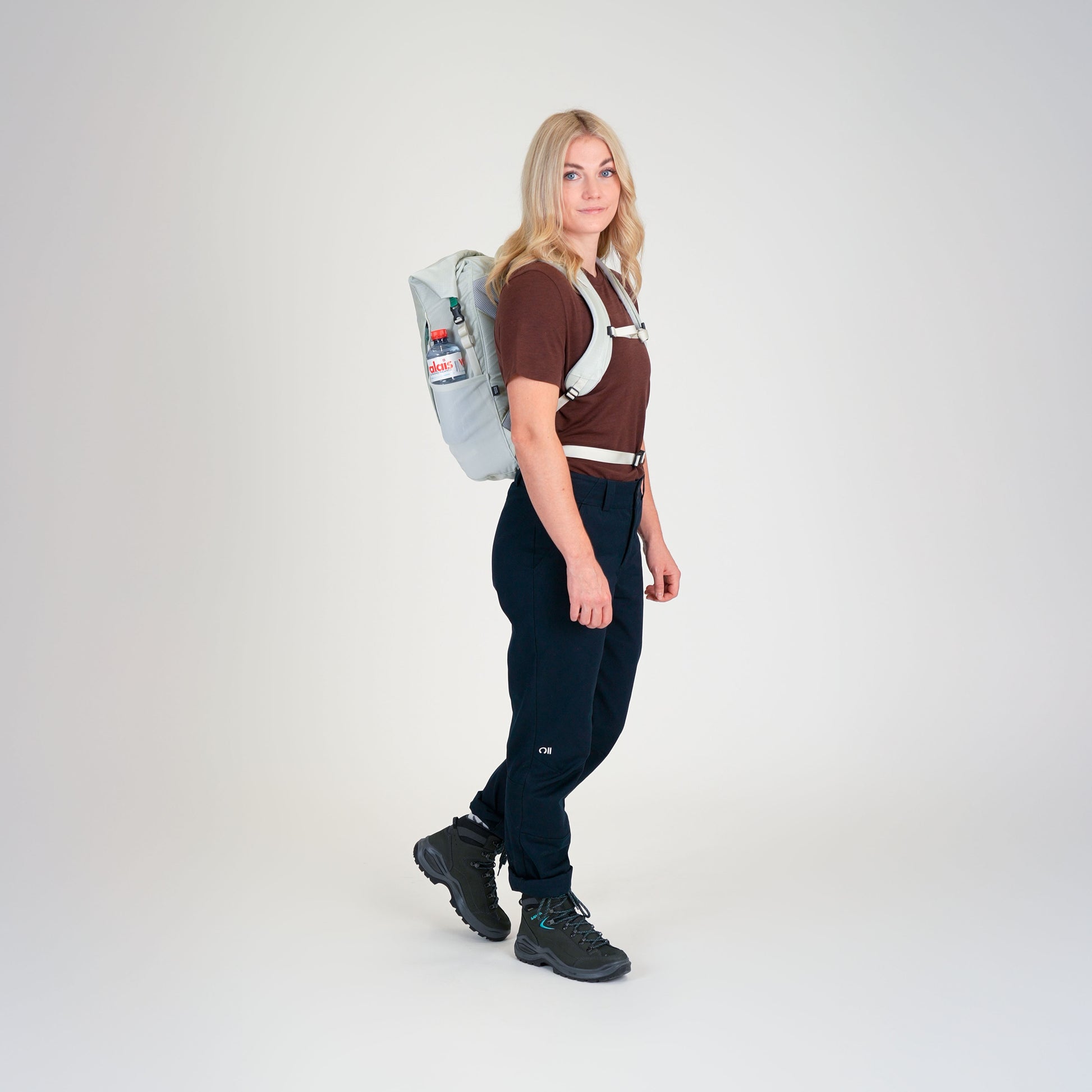 2. For a cleaner look, roll the opening back 3 times & clip it to the hidden side straps. -